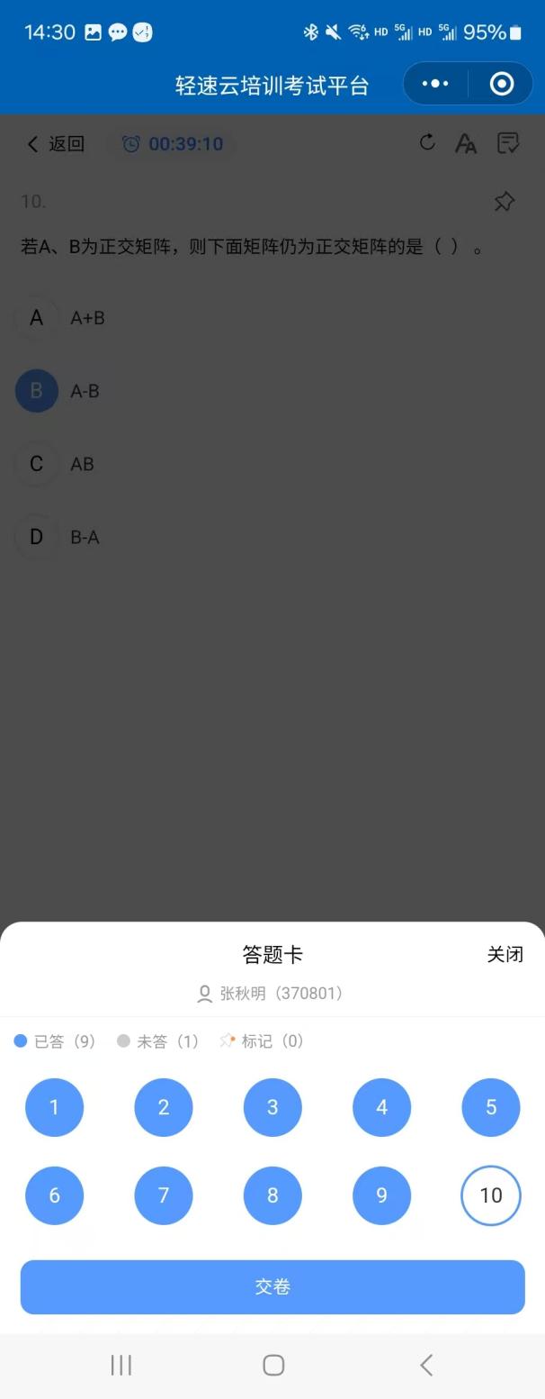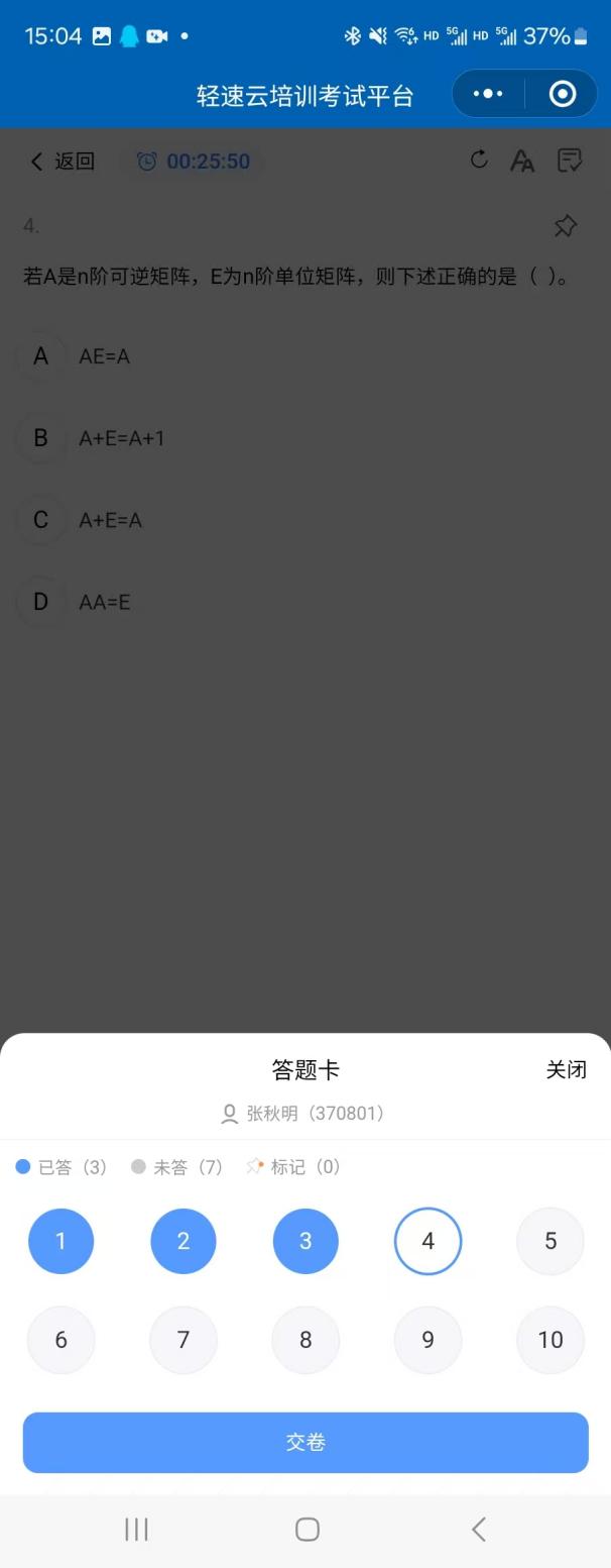 考生在考试过程中也可以点击左下角“答题卡”按钮,进入答题卡界面。该界面展示考生的答题情况:蓝色圆实心按钮表示该题目已完成作答,蓝色圆空心按钮表示该题还未作答。