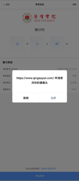 点击“考试科目”后准备进入考试界面,系统调用手机摄像头,点击“允许”调用本机摄像头。