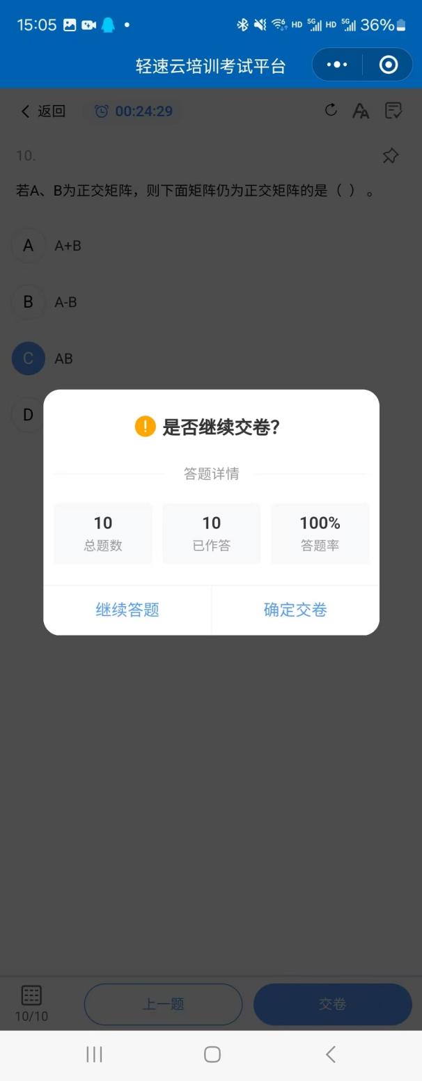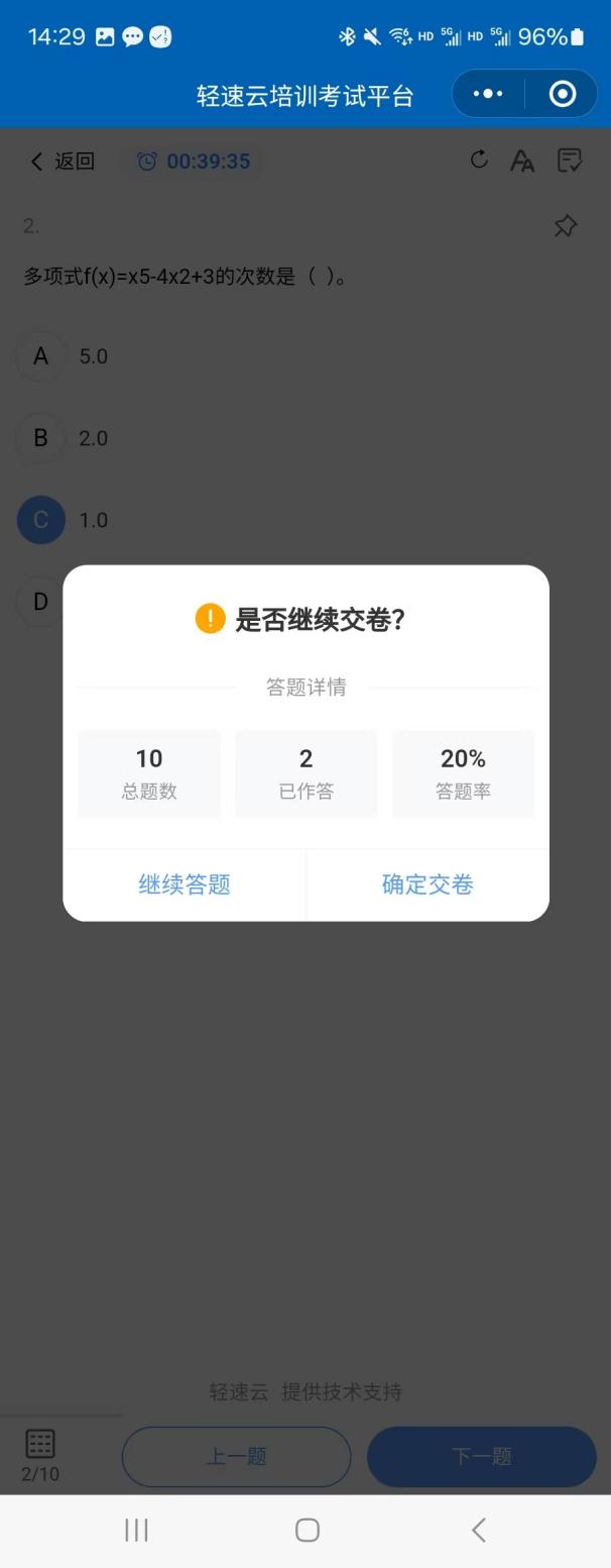 考生做完试卷全部题目,“下一题”自动变为“是否继续交卷”按钮,确认答题完成后,点击,系统弹出提交确认框。
