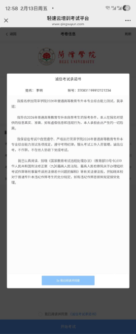进入考试界面,确认考生信息,点击下方“诚信考试承诺书”进行阅读确定,并勾选。