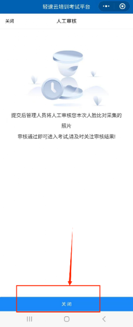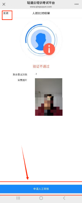 如果人脸比对失败,点击下方“申请人工审核”按钮后管理人员将人工审核本次人脸比对照片,等待5—10秒,点击下方“关闭”或左上角“关闭”按钮,返回考试列表,再次点击考试名称,自动进入下一环节。(人脸比对验证通过,无需关注此步骤)